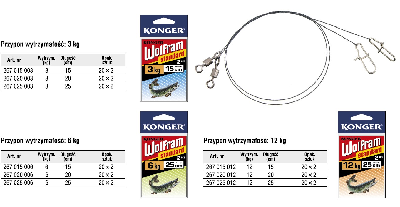 przypon o długości 15, 20 lub 25 cm, średnicy 0,10 mm i wytrzymałości 2,5 kg.