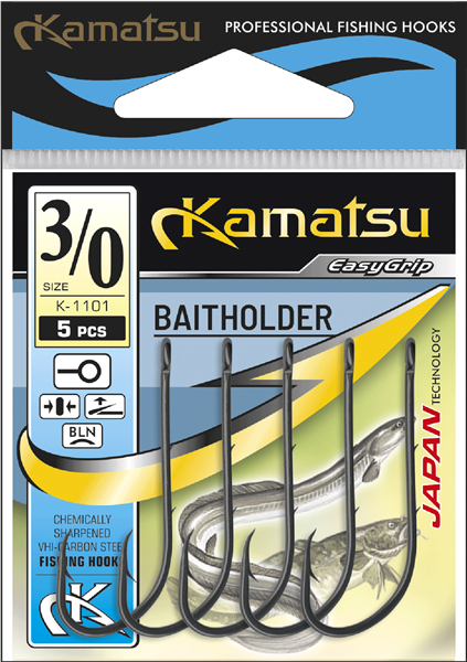 Baitholder – haki doskonale trzymają przynętę, a to za sprawą dodatkowych zadziorów na trzonku. Szczególnie polecane do łowienia na pęczki czerwonych r o b a k ó w, r o s ó w k i , a także martwą rybkę.