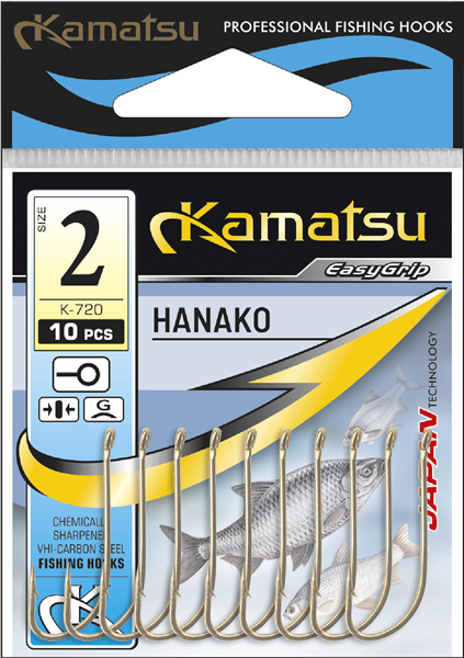 Hanako – seria haczyków z mikrozadziorem. Model polecany do wszystkich metod spławikowych. Najmniejsze haki doskonałe do pinki, większe do białych i czerwonych robaków a także do wszelkiego rodzaju kanapek i przynęt roślinnych.