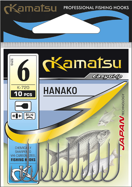 Hanako – seria haczyków z mikrozadziorem. Model polecany do wszystkich metod spławikowych. Najmniejsze haki doskonałe do pinki, większe do białych i czerwonych robaków a także do wszelkiego rodzaju kanapek i przynęt roślinnych.