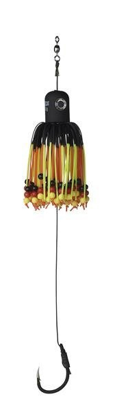 Chwyć za clonka i przesuń jego korpus, aż osiągniesz żądaną odległość od haka, a następnie po prostu go zablokuj. Ze względów bezpieczeństwa zastosowano tutaj tylko jeden hak (aby zmniejszyć ryzyko, że wolny hak przebije ponton lub rękę wędkarza). Wykonany w koncepcie A-STATIC: aby zminimalizować pole elektryczne, które płoszy sumy. Uwaga: gumowa powłoka na haku może ulec zużyciu podczas użytkowania! Rozmiary haka: # 8/0 (100g) lub # 10/0 (150, 200 i 250g).