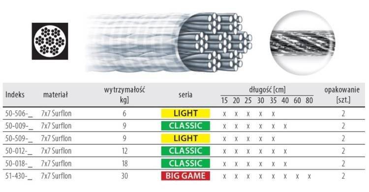 49-włóknowa plecionka w kolorze srebrnym, w przeźroczystej otulinie nylonowej, poprawiającej odporność na skręcanie.