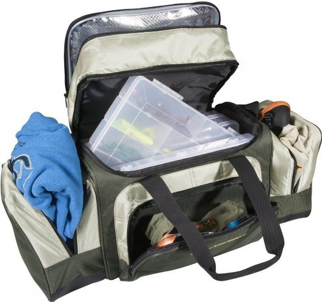 być wykorzystana na zapasowy kołowrotek, dodatkowe przynęty i drobniejszy sprzęt. Torba posiada dwa uchwyty zabezpieczone