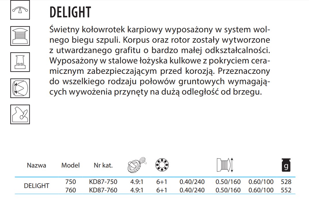 Dołożyliśmy wszelkich starań, by w nowym katalogu, każdy wędkarz znalazł coś idealnego dla siebie również w kategorii kołowrotków. Na szczególną uwagę zasługują kołowrotki: Norway Quest M-Skrei – stworzony z myślą o najcięższych warunkach pogodowych na morzu, zaawansowany technicznie kołowrotek Black Crystal Cat, który zasilił dział sumowy, Method Feeder’owy kołowrotek Katsudo Runner i poszerzający dział karpiowy, kołowrotek Carp Temptation.