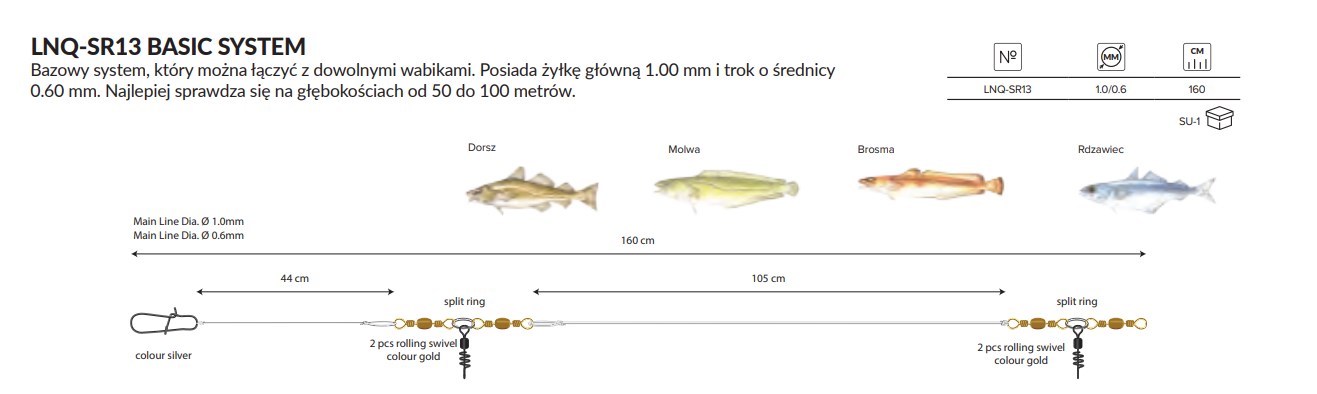 Bazowy system, który można łączyć z dowolnymi wabikami. Posiada żyłkę główną 1.00 mm i trok o średnicy 0.60 mm. Najlepiej sprawdza się na głębokościach od 50 do 100 metrów.