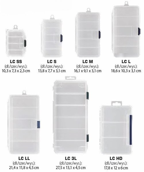 Siedem transparentnych pudełek różnej wielkości o stałych przegródkach (z wyjątkiem modelu SS i HD o wymiennych ściankach) umiejscowionych w poprzek.