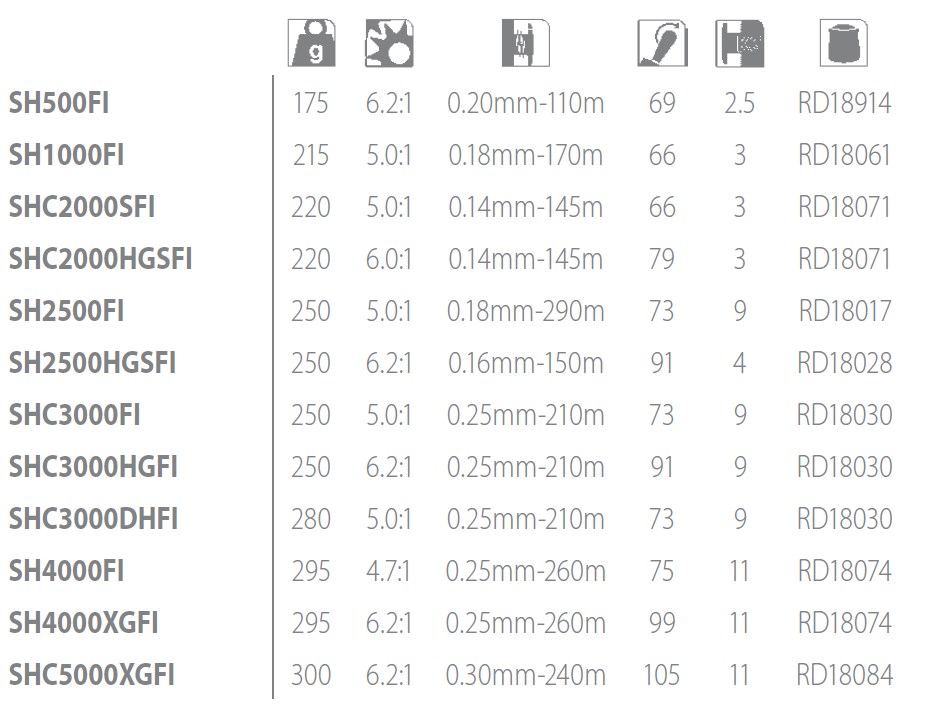 Rozmiar kołowrotka - kołowrotki SHIMANO są na ogół dostępne w rozmiarach: 500, 750, 1000, 2000, 2500,