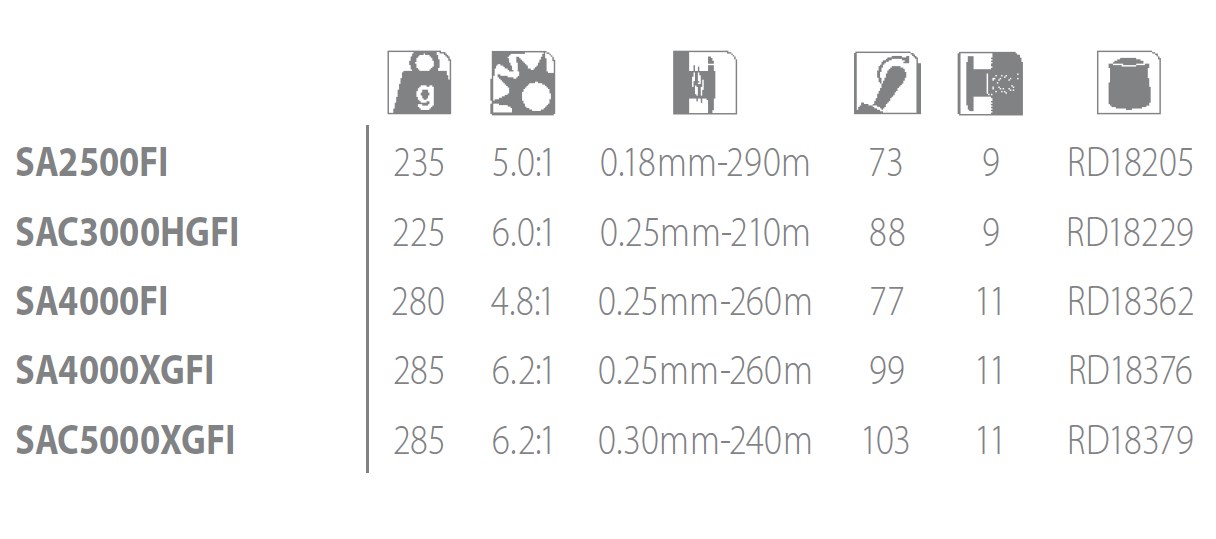 różnej gamie rozmiarów. Im większy rozmiar kołowrotka, tym większa pojemność szpuli (z wyjątkiem szpuli płytkiej o oznaczeniu S lub SS)