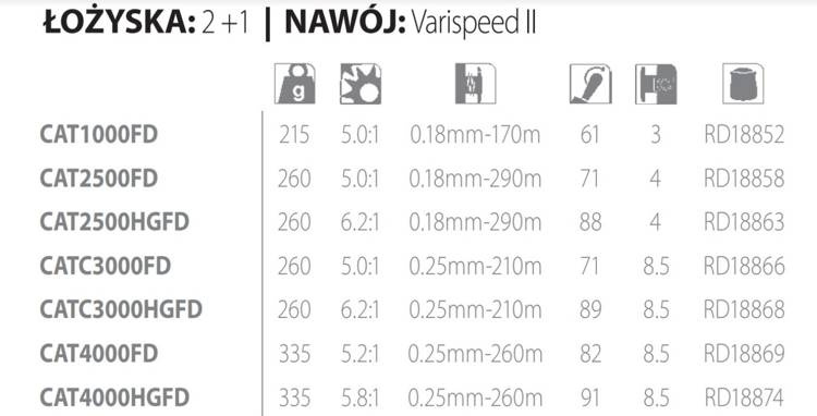 Sugerowane zastosowanie poszczególnych rozmiarów kołowrotków catana fd: