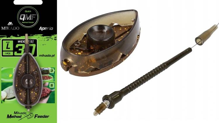 Ewolucja świetnych koszyków Method Feeder Aperio. Q.M.F. to system pozwalający w szybki i łatwy sposób wymienić podajnik bez konieczności rozbrajania całego zestawu. Wystaczy zdjąć gumową tulejkę, zsunąć koszyk z trzpienia i zamienić go innym modelem.