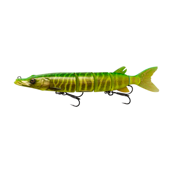 Przynęta płynie z bardzo naturalną wężowatą akcją i obraca się na bok podczas przerwy w zwijaniu, co prowokuje do ataku podążającego za wabikiem drapieżnika. W segmencie ogonowym zabudowana jest grzechotka, która generuje nęcące klikanie podczas prowadzenia. Znajdziesz tu trzpieniowe łączniki segmentów, super ostre kotwice i foto-realistycznie odwzorowane kolory. To wspaniała przynęta zarówno do łowienia dużych szczupaków z ręki, jak i w trollingu. Wabik jest wolno tonący i pracuje w zakresie prędkości od 1 do 4.3 węzła (1 kts to 1,852 km/h).