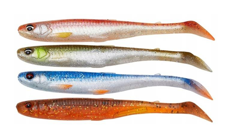 Zestaw czterech bardzo skutecznych gum Slender Scoop Shad w kolorach,